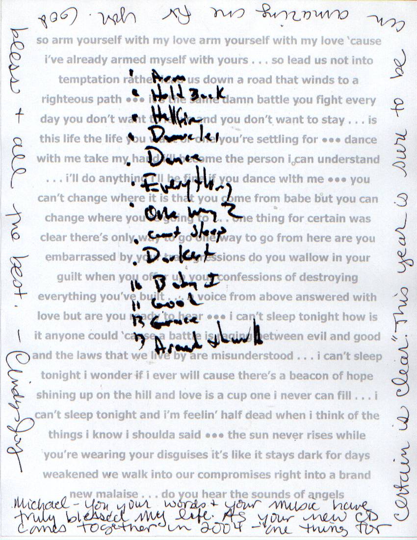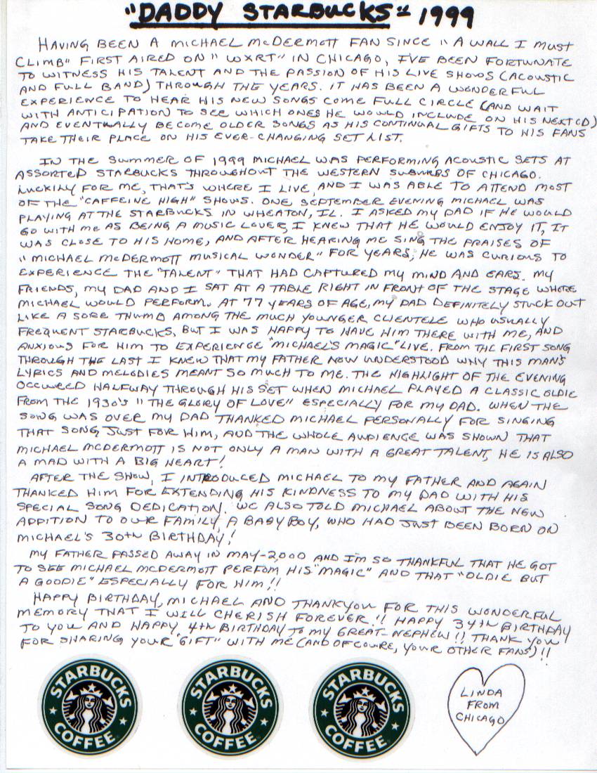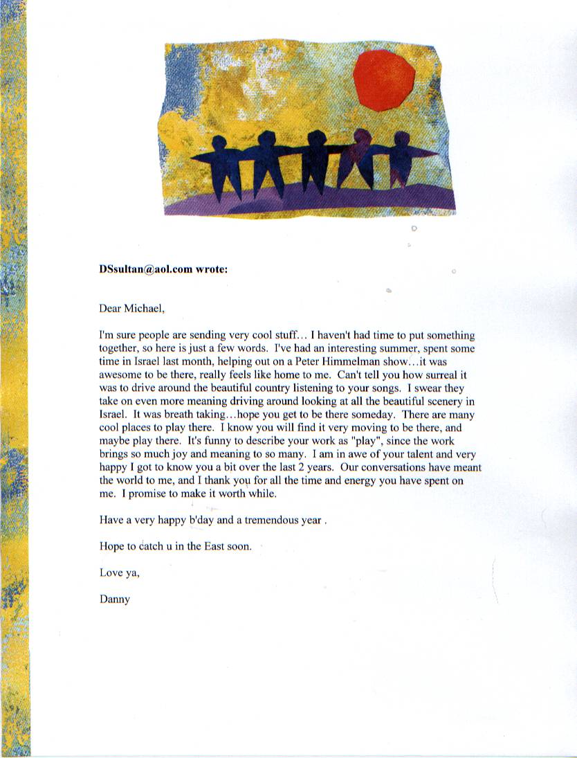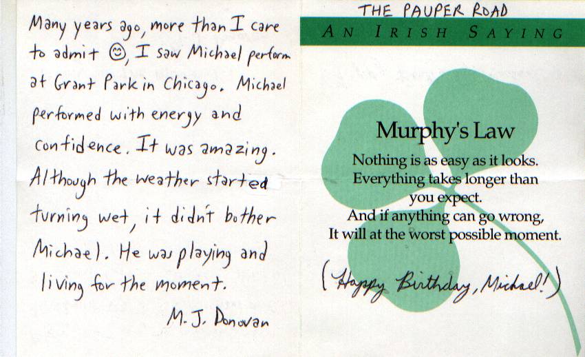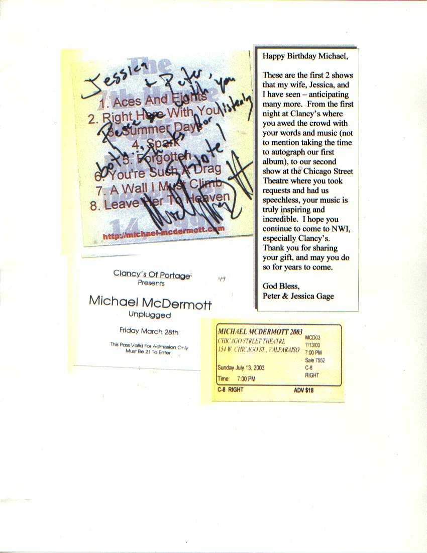 First, I just want to say thank you so much to everyone who participated in Michael's 2003 birthday surprise...which, like last year, proved an amazing joint endeavor by the large supportive family who all in one way or another share the McDermott name. And, "large" is indeed yet again an appropriate word here, as the call for submissions once more included responses from all across the United States, and even as far away as Spain and Israel! (underscoring a fact which we "paupers" have long known, of course...that Michael is indeed a "world-class" artist!) And, on 8/21/03, the gift was sent out via Express Mail -- with verification of its receipt subsequently arriving on 8/22. So, now that the date of the event for which it was intended has officially passed, here's a glimpse at our collective experiences along "The Pauper Road"...