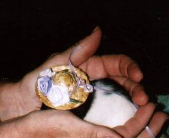 To explain this particular mom and her family, the following is an excerpt from an e-mail I sent Marna...the fellow crazy woman "who dresses her rats in little outfits" -- and makes all the outfits in which I dress my own. She also breeds fancy rats and we've therefore struck up quite a lovely ongoing conversation about these wonderful and hugely misunderstood little pets. "Marna, you were so right when you said even when you don't breed rats, they multiply!!!! It turned out Keela was pregnant when we got her...the guy had said there was a slight chance of this as she had just that day been with a male. He also said we could bring the babies back once they were weaned if we still wanted her. Well, that's great in theory...then three and a half weeks later these amazing little creatures appear. And, within days it becomes increasingly apparent how wonderful they all are. Then we go to the vet with Maggie and take a couple along....of course, Dr. Steve goes into a panic at the thought of them going to other homes where their end might not be that of a healthy happy pet. Anyway, long story short, it seems we now have a VERY large rat family!" So, without further ado, I present a very special mom, and her equally special offspring... Pre-babies Keela...