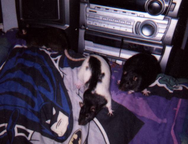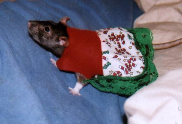 Here are a few photos of Molly and the boys in clothing "designed and handcrafted by a nut that often dresses her rats in little outfits" (a Wisconsin maker of sled dog harnesses -- who, obviously, has a few fancy rats of her own...and a wonderful sense of humor!) First up is Molly in her holiday party dress...