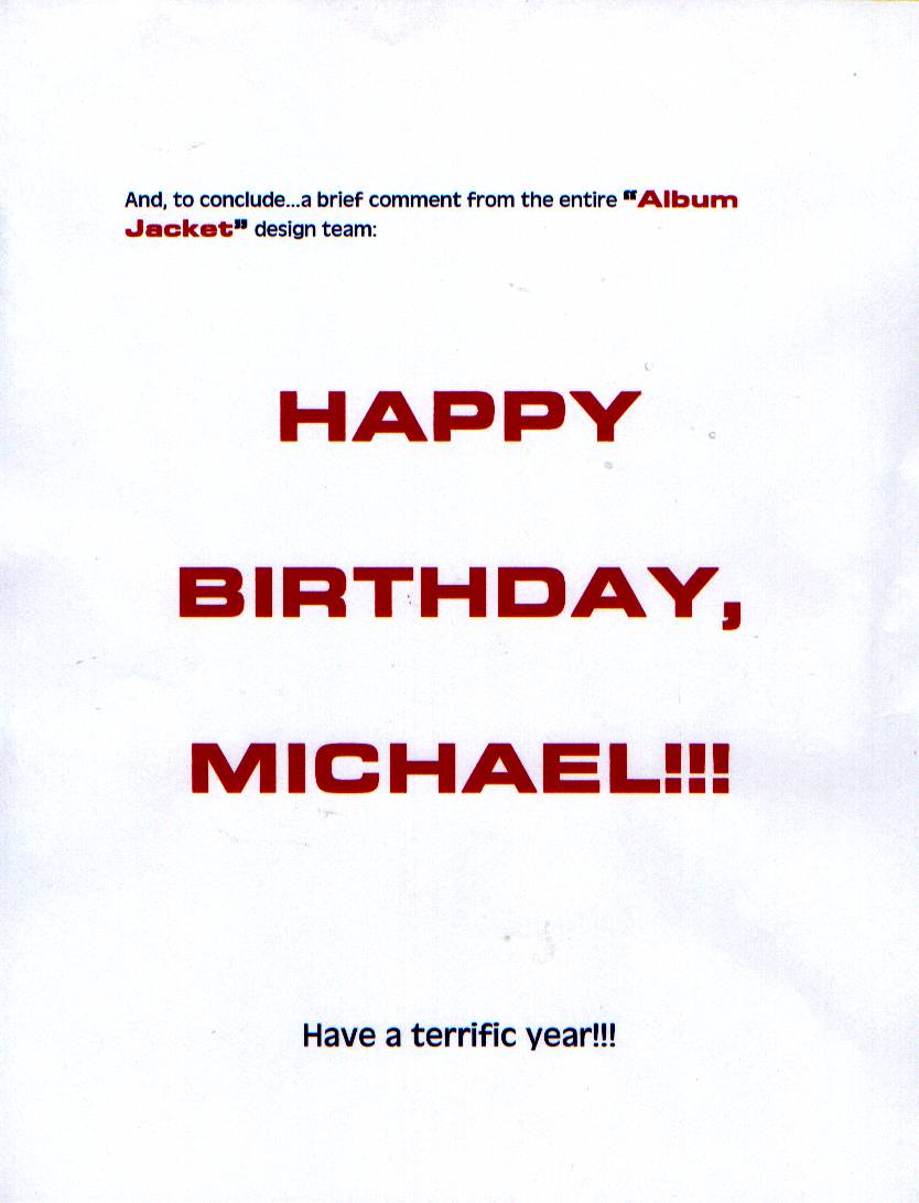 (NOTE: All pages of the book actually sent to Michael were printed on the same design paper as the cover, with an even more celebratory "Happy Birthday" page, not the plain versions shown here.) Of course, no CD case would be complete without shrinkwrap, and we certainly wouldn't want to give Michael something "substandard", would we?