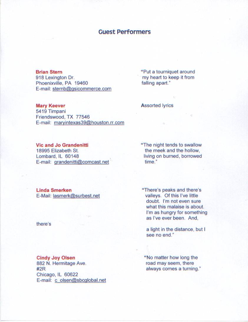 ...which booklet, of course, includes the previously noted page explaining the whole project to Michael, an introduction to how the whole idea was brought together -- i.e. the web page calling for submissions, etc. -- a list of "Guest Performers" (just a sampling/p.1 of these is shown below)...
